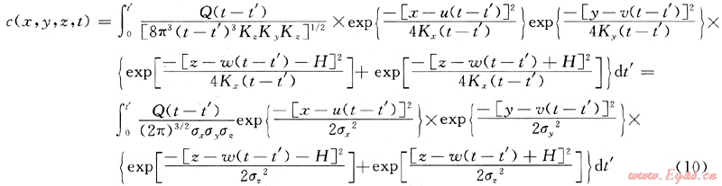 根據(jù)動態(tài)泄漏率不定常的特點,以氣體動力學(xué)理論和湍流擴散微分方程為基礎(chǔ),結(jié)合相應(yīng)的初始條件和邊界條件,利用格林函數(shù)進行推導(dǎo),可得綜合擴散模型格林函數(shù)為: