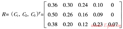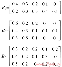 首先對(duì)U集中Ui作單因素評(píng)判,從因素Ui來(lái)確定評(píng)語(yǔ)集Vj(j=1,2,3…,m)的隸屬度rij,這樣就得到一個(gè)Ui的單因素評(píng)判集Ri={ri1,ri2,ri3,…,rim},R就反應(yīng)了U、V之間存在的某種模糊約束關(guān)系:
