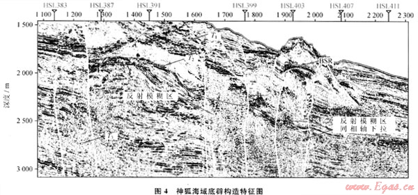 底辟構(gòu)造和天然氣水合物的形成與運(yùn)移聚集也有密切的關(guān)系,底辟構(gòu)造由地球深部物質(zhì)上拱或刺穿到淺部產(chǎn)生,在形成過程中會引起構(gòu)造側(cè)翼和頂部沉積層的傾斜和破裂,促使流體的排放,因而對水合物的形成十分有利。大量的調(diào)查資料顯示[14~15]:珠江口盆地白云凹陷中心有大量底辟群的存在,在神狐海域前期調(diào)查中,識別出了5個泥底辟異常反射體,其中4個位于白云凹陷內(nèi)。這些識別出來的底辟構(gòu)造在高分辨率地震剖面上表現(xiàn)特征主要為地震反射模糊區(qū)(帶),橫向上反射同相軸的連續(xù)性變差或錯斷,內(nèi)部反射較雜亂,甚至為空白反射,局部見同相軸下拉現(xiàn)象;其兩側(cè)、頂部常見亮點(diǎn)振幅異常,白云凹陷北坡鉆井已揭示這種亮點(diǎn)與氣層存在良好對應(yīng)關(guān)系。因此,推斷這種反射模糊區(qū)應(yīng)為流體作用的結(jié)果(圖4)[16]。底辟構(gòu)造的存在說明凹陷中心曾經(jīng)孕育著高壓、超壓系統(tǒng)。由于現(xiàn)今地層具有正常壓力,這說明超壓的累積和釋放與深部烴源巖生烴及排烴有一定的關(guān)系。與底辟構(gòu)造密切伴生的大量亮點(diǎn)指示著沿底辟構(gòu)造的天然氣垂向輸導(dǎo),構(gòu)成了古近系油氣運(yùn)移到新近系 第四紀(jì)的成藏動力系統(tǒng)。底辟構(gòu)造的發(fā)育在不同深度形成了上覆拱張,上覆地層產(chǎn)生了高角度的斷裂和垂向裂隙系統(tǒng),構(gòu)成流體運(yùn)移的另一個通道。