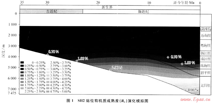 2007年4~6月,廣州海洋地質(zhì)調(diào)查局在神狐海域研究區(qū)內(nèi)實施了天然氣水合物鉆探,先后在3個站位成功鉆獲了天然氣水合物實物樣品,對其中的SH2站位沉積物樣品中的氣體進(jìn)行的氣相色譜分析的結(jié)果顯示[10]:CH4的體積分?jǐn)?shù)占96%~99%,C2H6和C3H8的體積分?jǐn)?shù)很低,干燥系數(shù)(C1/C2)一般在數(shù)百至1000以上,為典型的干氣。SH2站位含水合物層的總有機(jī)碳含量平均值為0.43%,已達(dá)到了作為生物氣烴源巖的標(biāo)準(zhǔn),對SH2站位進(jìn)行有機(jī)質(zhì)成熟度的熱演化模擬(圖1),結(jié)果表明:淺部地層珠江組、韓江組、粵海組和萬山組Ro值低于0.7%,多在0.2%~0.6%,處于未熟-低成熟的生烴門限附近,屬于良好的生物氣的烴源巖。這幾套層序厚度大,泥巖含量高,熱成熟低,有機(jī)質(zhì)豐度較高[11],其中,上中新統(tǒng)-第四系海相泥巖有機(jī)碳含量平均為0.22%~0.49%,且不同層位及層段均變化不大,第四系有機(jī)碳含量平均為0.22%~0.28%,上新統(tǒng)有機(jī)碳含量平均為0.30%~0.39%,上中新統(tǒng)有機(jī)碳含量平均為0.49%;上中新統(tǒng)-全新統(tǒng)海相泥巖生烴潛力(S1+S2)平均為0.13~0.32mg/g,與鶯歌海盆地大體一致。由此推測,該區(qū)具備生成生物氣的巨大潛力。
