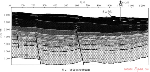 由于受區(qū)域構(gòu)造運(yùn)動,特別是新構(gòu)造運(yùn)動的作用,神狐研究區(qū)內(nèi)斷裂構(gòu)造發(fā)育。斷層可分為北東、北西和北北西向3組,且均為正斷層,其中北東向斷層有明顯切割北西向斷層的趨勢。斷層活動時間大致可分為晚中新世和上新世以來2個主要時期,晚中新世斷層以北西向為主,主要分布于研究區(qū)中北部,斷層大部分切割上中新統(tǒng),部分切穿上新統(tǒng),是研究區(qū)最主要斷層活動時期;上新世以來活動斷層以北東向為主,斷層活動強(qiáng)度小,但數(shù)量眾多。由于這些斷層貫通了下部氣源巖系與上部水合物形成的溫壓穩(wěn)定帶層系,改善了天然氣的垂向運(yùn)移條件,而斷層活動時間又橫跨生氣和排氣高峰期,成為構(gòu)成流體運(yùn)移的一個主要通道。同時,應(yīng)該注意到如果斷層過大,直通海底,會造成部分氣體的散失。從過SH2站位地震剖面流體運(yùn)移模擬結(jié)果來看(圖3),由于該處發(fā)育斷裂,直通海底,導(dǎo)致深部熱解氣源部分通過斷裂直通海底散失,未能有效運(yùn)移至水合物穩(wěn)定域,所以鉆井處熱解氣源對水合物貢獻(xiàn)較小。同時從圖中烴氣運(yùn)移方向分析,該處鉆遇的水合物主要為淺層生物成因氣通過橫向運(yùn)移至水合物穩(wěn)定域形成。