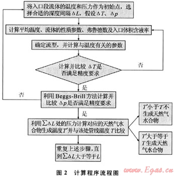 應(yīng)用上述的溫度模型結(jié)合Beggs-Brill方法計(jì)算管線內(nèi)溫度、壓力分布時(shí),由于只涉及產(chǎn)出氣的相對(duì)密度,因此預(yù)測(cè)管線內(nèi)天然氣水合物能否生成時(shí),采用經(jīng)驗(yàn)圖解法與溫度壓力模型進(jìn)行耦合[7],從而得到天然氣水合物生成條件預(yù)測(cè)理論模型,并編制了相應(yīng)的計(jì)算程序,計(jì)算程序流程如圖2所示。