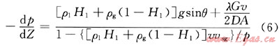 式中ρ1為液相密度,kg/m3;ρg為氣相密度,kg/m3;H1為持液率;g為重力加速度,m/s2;0為管線傾角,(°);λ為阻力系數(shù);G為混合物的質(zhì)量流量,kg/s;v為混合物平均流速,m/s;vsg為氣相表觀流速,m/s;p為管線平均壓力,Pa,D為管徑,m;A為橫截面積,m2。