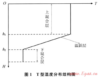 值得注意的是深水中垂向溫度分布較陸地復(fù)雜得多[5]:深水中,隨著深度的增加環(huán)境溫度是逐漸降低的,和陸地不同,深水垂向溫度呈現(xiàn)不規(guī)則的變化,一般可以擬合為多種垂向溫度分布結(jié)構(gòu);陸上垂向溫度分布隨季節(jié)變化很小,而深水環(huán)境中則不同,甚至分布結(jié)構(gòu)也會(huì)發(fā)生變化,因此,采用最常見的T型分布結(jié)構(gòu)進(jìn)行計(jì)算。所謂T型結(jié)構(gòu)即呈現(xiàn)為上面為混合層,中間為溫躍層,下面為混合層的3層結(jié)構(gòu),躍層上、下界點(diǎn)明顯,如圖1所示。