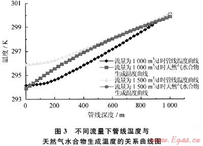 由圖3可以看出,隨著壓力的增加,天然氣水合物的生成溫度逐漸增高。流量增大后,管線溫度曲線明顯上移,且受外界環(huán)境溫度的影響減弱,這是因?yàn)榱魉偌涌旌罅黧w與外界環(huán)境之間的熱交換時(shí)間減少所致;而此時(shí)天然氣水合物生成溫度曲線卻有輕微的下移,這是因?yàn)榱髁吭龃蠛?,摩擦損失增大,導(dǎo)致管線內(nèi)對(duì)應(yīng)點(diǎn)的壓力減少。也就是說,流量增大導(dǎo)致2條曲線向相反的方向發(fā)展,因而,可以通過調(diào)整流量來實(shí)現(xiàn)管線的正常傳輸。在上例中,流量不能低于1500m3/d,這樣才能保證該管線的正常傳輸。