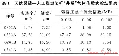 “并聯(lián)”傳質實驗中,裂縫寬度是影響致密砂巖天然氣傳質的關鍵參數(shù),裂縫寬度越大其傳質效率越高。在天然裂縫-人工裂縫并聯(lián)傳質實驗中,裂縫寬度相近的兩類裂縫,人工裂縫傳質效率低于天然裂縫。分析認為,由于人工裂縫縫面屬于新鮮斷面,有較多的可動微粒,隨著驅替壓差的增加,氣體流速增大,參與運移的微粒增多,部分微粒在縫面狹窄處沉積、堵塞,使得裂縫滲流能力大幅降低;另外實驗過程是采取的連續(xù)變驅替壓力,圍壓不變的方式,在長時間的圍壓(3MPa)條件下,由于有效應力的時間效應[8],無支撐的人工裂縫寬度相應降低,而天然裂縫經過漫長的地質演化,天然縫縫面間有膠結物、顆粒支撐,抗應力敏感能力強于天然縫,裂縫寬度變化相應較小,其滲流能力降低幅度小。
