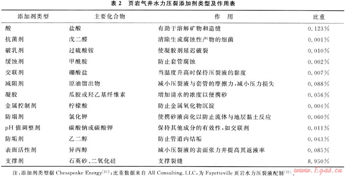 無(wú)論是在頁(yè)巖氣開發(fā),還是在常規(guī)油氣開發(fā)的壓裂過(guò)程中,壓裂液及其性能都是影響壓裂最終效果的重要因素。壓裂液及其性能對(duì)能否造出一條足夠尺寸的、有足夠?qū)Я髂芰Φ牧芽p有直接關(guān)系。清水壓裂液組成以水和砂為主,含量占總量的99%以上,其他添加劑成分占?jí)毫岩嚎偭康牟蛔?%。添加劑在壓裂液中所占的比例很小,但對(duì)提高頁(yè)巖氣井的產(chǎn)量說(shuō)卻是至關(guān)重要。頁(yè)巖水力壓裂常見添加劑類型及其作用見表2。