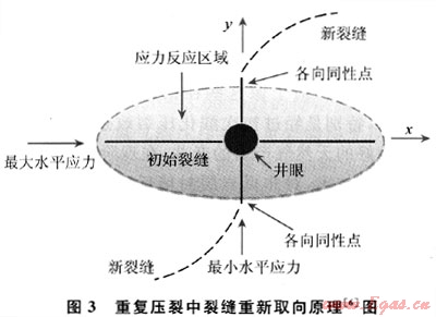 重復(fù)壓裂是指當(dāng)頁(yè)巖氣井初始?jí)毫烟幚硪呀?jīng)無(wú)效或現(xiàn)有的支撐劑因時(shí)間關(guān)系損壞或質(zhì)量下降,導(dǎo)致氣體產(chǎn)量大幅下降時(shí),采用壓裂工藝對(duì)氣井經(jīng)行重新壓裂增產(chǎn)的工藝。頁(yè)巖氣井初始?jí)毫押?,?jīng)過(guò)一段時(shí)間的生產(chǎn),井眼周圍的應(yīng)力會(huì)發(fā)生變化,重復(fù)壓裂能夠重新壓裂裂縫或使裂縫重新取向,使頁(yè)巖氣井產(chǎn)能恢復(fù)到初始狀態(tài)甚至更高(圖3)。美國(guó)Barnett頁(yè)巖在1995年前廣泛使用凝膠壓裂,1997年開始發(fā)展清水壓裂,作業(yè)者對(duì)先前使用凍膠壓裂增產(chǎn)產(chǎn)量下降的井使用清水壓裂重新改造,改進(jìn)處理液回收工作流程,氣井產(chǎn)量明顯提高,部分井產(chǎn)量甚至超過(guò)了初次壓裂時(shí)的產(chǎn)量[5]。