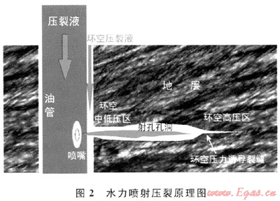 水力噴射壓裂是用高速和高壓流體攜帶砂體進(jìn)行射孔,打開地層與井筒之間的通道后,提高流體排量,從而在地層中打開裂縫的水力壓裂技術(shù)(圖2)。當(dāng)頁(yè)巖儲(chǔ)層發(fā)育較多的天然裂縫時(shí),如果用常規(guī)的方式對(duì)裸眼井進(jìn)行壓裂,大而裸露的井壁表面會(huì)使大量流體損失,從而影響增產(chǎn)效果。水力噴射壓裂能夠在裸眼井中不使用密封元件而維持較低的井筒壓力,迅速、準(zhǔn)確地壓開多條裂縫。2005年,水力噴射壓裂技術(shù)第一次使用在美國(guó)Barnett頁(yè)巖中,作業(yè)者使用水力噴射環(huán)空壓裂工藝對(duì)Barnett頁(yè)巖中的53口井進(jìn)行了壓裂,其中26口井取得了技術(shù)和經(jīng)濟(jì)上的成功,有21口井被認(rèn)定為技術(shù)成功[4]。
