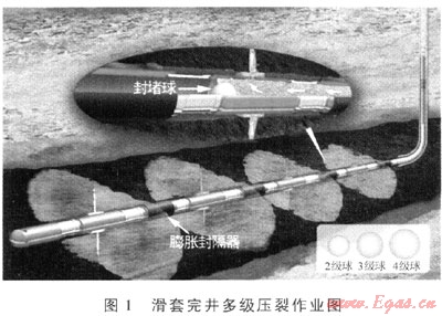 多級(jí)壓裂是利用封堵球或限流技術(shù)分隔儲(chǔ)層不同層位進(jìn)行分段壓裂的技術(shù)。多級(jí)壓裂能夠根據(jù)儲(chǔ)層的含氣性特點(diǎn)對(duì)同一井眼中不同位置地層進(jìn)行分段壓裂,其主要作業(yè)方式有連續(xù)油管壓裂和滑套完井兩種。多級(jí)壓裂技術(shù)是頁(yè)巖氣水力壓裂的主要技術(shù),在美國(guó)頁(yè)巖氣生產(chǎn)井中,有85%的井是采用水平井和多級(jí)壓裂技術(shù)結(jié)合的方式開采,增產(chǎn)效果顯著。美國(guó)Newfield公司在Woodford頁(yè)巖中的部分開發(fā)井采用了5~7段式的分段壓裂,頁(yè)巖氣單井最大初始產(chǎn)量達(dá)到28.32×104m3/d,最大最終產(chǎn)量達(dá)16.99×104m3/d[1]。