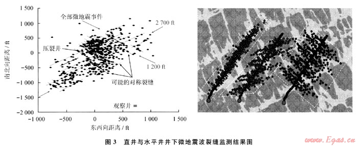 采用上述方法,通過井下微地震波測(cè)試,證實(shí)頁(yè)巖氣直井滑溜水大規(guī)模壓裂和水平井分簇射孔分段壓裂形成網(wǎng)絡(luò)裂縫,提高了壓裂改造效果(圖3)。