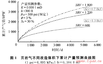 頁(yè)巖氣儲(chǔ)層滲透率超低,厚度大,天然裂縫發(fā)育,氣體主要以吸附態(tài)吸附在有機(jī)質(zhì)表面,常規(guī)改造形成單一裂縫很難獲得好的增產(chǎn)效果。數(shù)值模擬研究表明[3],頁(yè)巖氣儲(chǔ)層改造的體積(SRV,106ft3;1ft3=0.028317m3,下同)越大,壓后增產(chǎn)效果越好(圖1)。但要實(shí)現(xiàn)體積改造,除地層要具備體積壓裂的基本條件外,壓裂改造工藝方法也十分關(guān)鍵。