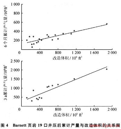 在Barnett頁(yè)巖19口有井下微地震監(jiān)測(cè)資料的井,改造后的體積與壓后6個(gè)月和3a累計(jì)產(chǎn)量的比較曲線見圖4。由圖4可見:19口井的壓裂改造體積在5.3×106~52.7×106m3,且壓后4個(gè)月的累計(jì)產(chǎn)量隨著改造體積的增加而增加,壓后3a增加的幅度更大,這充分說明改造體積對(duì)頁(yè)巖氣壓后產(chǎn)量的重要作用。