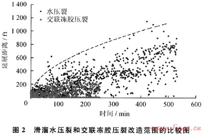 3) 敏感性不強(qiáng),適合大型滑溜水壓裂。弱水敏地層,有利于提高壓裂液用液規(guī)模,同時(shí)使用滑溜水壓裂,滑溜水黏度低,可以進(jìn)入天然裂縫中,迫使天然裂縫擴(kuò)展到更大范圍,大大擴(kuò)大改造體積。圖2為滑溜水壓裂和交聯(lián)凍膠壓裂改造范圍的比較曲線。