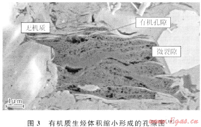 目前有研究認為,頁巖中的孔隙以有機質生烴形成的孔隙為主(圖3)。據(jù)Jarvie等人研究,有機質含量為7%的頁巖在生烴演化過程中,消耗35%的有機碳可使頁巖孔隙度增加4.9%[18]。有機微孔的直徑一般為0.01~1μm。