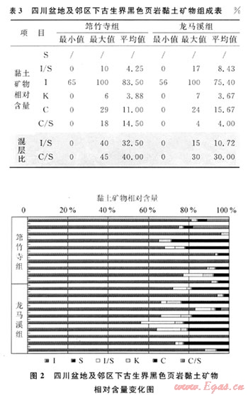 Bowker研究認為,Barnett頁巖層中黏土礦物主要為微含蒙皂石的伊利石[10]。四川盆地及鄰區(qū)筇竹寺組和龍馬溪組頁巖儲層黏土礦物分析結果也表明其組成主要是伊利石,其次為綠泥石,不含蒙皂石,有少量的高嶺石和伊/蒙混層(表3、圖2)。筇竹寺組的伊利石含量較龍馬溪組高,平均值為83.5%,I/S混層比在0~40%,平均為32.5%;龍馬溪組的綠泥石平均含量為15.67%,I/S混層比平均為10.72%。