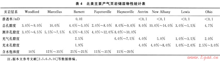 頁巖氣儲層具低孔、特低滲致密的物性特征。美國主要產氣頁巖儲層巖心分析總孔隙度分布在2.0%~14.00%,平均為4.22%~6.51%;測井孔隙度分布在4.0%~12.00%,平均為5.2%;充氣孔隙度分布在1.0%~7.5%,充水孔隙度為1.0%~8.0%(表4)。滲透率一般小于0.1mD,平均喉道半徑不到0.005μm[2]。