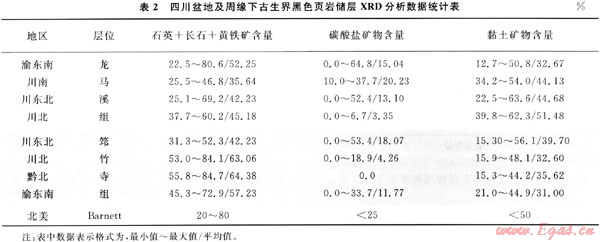 北美地區(qū)Barnett頁巖的石英、長石和黃鐵礦含量為20%~80%(其中石英含量為40%~60%),碳酸鹽礦物含量低于25%,黏土礦物含量通常小于50%。四川盆地下古生界2套頁巖的X射線熒光衍射(XRD)分析結果總體與Barnett頁巖相似(圖1、表2),其石英、長石和黃鐵礦的平均含量為30%~64%,碳酸鹽礦物的平均含量低于20%,極少數(shù)為0,黏土礦物含量平均在31%~51%。與Barnett頁巖對比,龍馬溪組的硅質含量偏少,筇竹寺組的含量偏多,但龍馬溪組的碳酸鹽礦物含量較高,而筇竹寺組的含量偏少。研究表明,石英等脆性礦物含量高有利于后期的壓裂改造形成裂縫;碳酸鹽礦物中方解石含量高的層段,易于溶蝕產生溶孔。