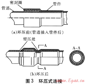 環(huán)壓式連接是將套有圓筒狀彈性體密封圈的管道插入環(huán)壓式管件的承口,用專用工具從外部沿承口圓周施壓,使承口連同管道一起局部下凹變形,壓縮承口的密封段,從而達到管道管件緊固密封的一種連接方式。其優(yōu)點是操作方便,易于安裝,連接強度高;缺點是密封圈和管件不是整體件,安裝中要特別注意其密封效果。環(huán)壓式連接見圖3。