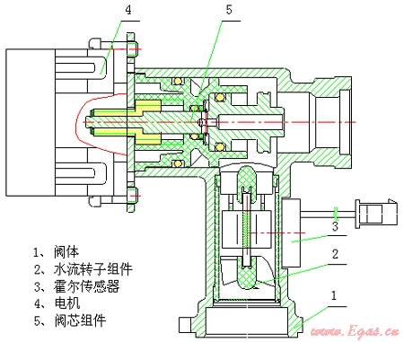 水量伺服閥主要由水流轉(zhuǎn)子組件、霍爾傳感器、閥芯組件、電機(jī)等組成。當(dāng)水流經(jīng)過渦輪殼時,推動磁性轉(zhuǎn)子旋轉(zhuǎn),不同磁極靠近霍元件時導(dǎo)通,離開時斷開,從而產(chǎn)生高低脈沖電平輸出給電腦控制器,再由控制器判斷計算出水流量的大小。當(dāng)燃?xì)饩咴O(shè)定不同的溫度時,控制器首先調(diào)節(jié)燃?xì)饪刂票壤y的出氣量同時通知電機(jī)拖動閥體組件調(diào)節(jié)出水口的水量大小。這樣,控制器可通過水溫反饋信號自動進(jìn)行細(xì)微的無級調(diào)節(jié),從而達(dá)到快速調(diào)節(jié)水溫、穩(wěn)定水溫目的。