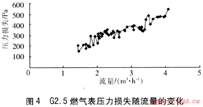 ③ 燃氣表的壓力損失普遍超出廠家提供的值,部分型號甚至超出了國家檢定規(guī)程的要求。燃氣表在接近最大流量時,壓力損失增加幅度更大,尤其是G2.5膜式表,在流量為4.08m3/h時,壓力損失已達542Pa。故燃氣表的選型不應只考慮量程范圍,還應考慮量程范圍內的壓力損失是否符合規(guī)范要求,以及大流量區(qū)間壓力損失增加幅度更大等因素。