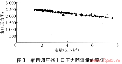 ② 調壓器出口壓力隨流量變化顯著,對于家用調壓器,為保證出口壓力不至于過低,應控制其通過流量為理論最大流量的60%左右。對于25m3/h調壓器,因為其出口壓力可調,通過流量范圍可適當放寬。