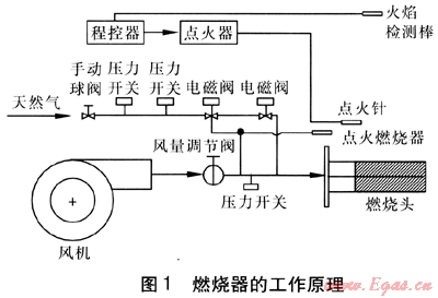 為了滿足實際應(yīng)用的需要,選用比例閥控制及燃燒控制系統(tǒng),使其具備預(yù)吹掃、自動點火、火焰檢測、熄火保護(hù)報警、燃?xì)飧叩蛪罕Wo(hù)、風(fēng)機(jī)故障保護(hù)、負(fù)荷可調(diào)等功能。燃燒器的工作原理見圖1。