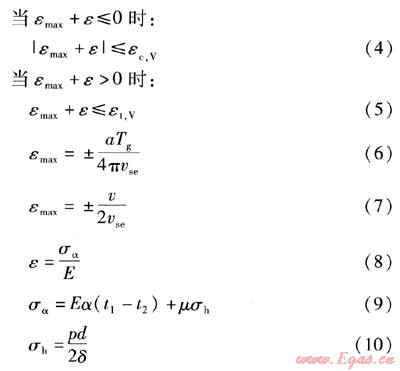 ④將管道附加應(yīng)變εLmax與式(4)、(5)由地震動(dòng)、內(nèi)壓和溫度變化引起的軸向應(yīng)變組合后,按下列公式校核管道的應(yīng)變狀態(tài)。當(dāng)不滿足下列公式時(shí),應(yīng)采取抗震措施。