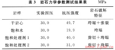評(píng)價(jià)井壁穩(wěn)定處理劑綜合性能的重要方法之一就是測(cè)量對(duì)比飽和處理劑與飽和水的巖石力學(xué)參數(shù)變化。室內(nèi)采用聚合物處理劑浸泡過(guò)的泥巖巖樣進(jìn)行巖石力學(xué)參數(shù)測(cè)試。實(shí)驗(yàn)結(jié)果見(jiàn)表3。