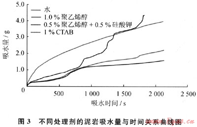 對(duì)比吸水量與時(shí)間關(guān)系曲線可知,泥巖在清水中的吸水量上升的最快,同一時(shí)間內(nèi)吸水量也最大。從總吸水量上來(lái)看,聚乙烯醇大于CTAB潤(rùn)濕反轉(zhuǎn)劑,大于聚乙烯醇和硅酸鉀混合溶液,說(shuō)明聚乙烯醇和硅酸鉀混合溶液的抗毛細(xì)管力自吸能力很好。CTAB潤(rùn)濕反轉(zhuǎn)劑相對(duì)封堵型的處理劑,吸水量還是略高,抑制效果稍差。通過(guò)此項(xiàng)實(shí)驗(yàn),能有效地模擬評(píng)價(jià)處理劑抑制泥頁(yè)巖自吸水的性能。