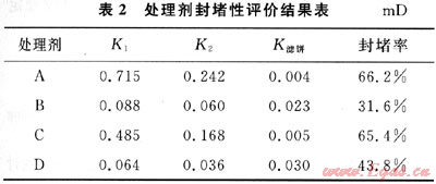 實(shí)驗(yàn)中采用代號(hào)為A、B、C、D的4種處理劑,在3.5MPa循環(huán)壓力下對(duì)取自井下同一深度的巖心進(jìn)行了封堵效果測(cè)試,結(jié)果見(jiàn)表2。