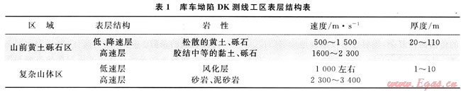 通過小折射、微測井等多種表層調(diào)查方法,已基本搞清了本工區(qū)內(nèi)表層結(jié)構(gòu)的特點(diǎn)(表1)。準(zhǔn)確的表層模型建立之后,逐點(diǎn)設(shè)計(jì)鉆井深度,保證震源在高速層中激發(fā),增強(qiáng)激發(fā)效果。