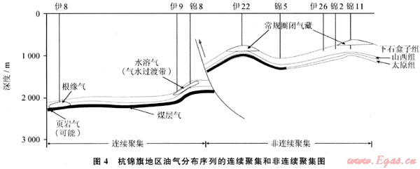 分布特征是從靜態(tài)要素對已形成的油氣藏進行研究,主要表現(xiàn)為油氣藏在盆地平面、剖面上的分布特征,從盆地中心向邊緣、從深部向淺部依次由烴源巖內部自生白儲的煤層氣或頁巖油氣過渡到烴源巖和儲層直接接觸的根緣油氣,進而過渡到烴源巖和儲層有一定距離的水溶氣和常規(guī)圈閉油氣,連續(xù)聚集通常具有超壓的特征。