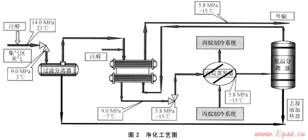 當(dāng)濕天然氣壓力較高或溫度較低時(shí),都易形成天然氣水合物,必須加入天然氣水合物抑制劑。在開工初期,雖然井口溫度較高,但管線溫度場(chǎng)未建立,也有生成天然氣水合物的可能。采用注入甲醇不回收工藝,采用移動(dòng)注醇車以節(jié)省投資;在凈化工藝的低溫分離段,采用注入乙二醇并回收的工藝,與注甲醇工藝相比,具有占地面積小、投資低、環(huán)境污染小、能耗小、運(yùn)行費(fèi)用低等優(yōu)點(diǎn)。
