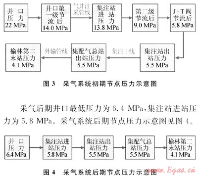 采氣后期井口最低壓力為6.4MPa,集注站進(jìn)站壓力為5.8MPa。采氣系統(tǒng)后期節(jié)點(diǎn)壓力示意圖見圖4。