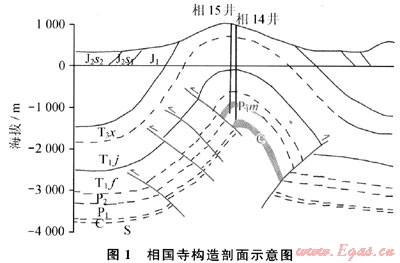 1) 相國(guó)寺石炭系氣藏構(gòu)造形態(tài)為狹長(zhǎng)梳狀背斜。構(gòu)造兩翼均發(fā)育有大型傾軸逆斷層,斷層向上消失于須家河組,向下則斷達(dá)志留系,斷層未破壞構(gòu)造、地層的完整性,對(duì)氣藏起到封閉作用(圖1)。
