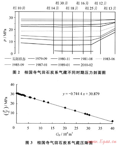 4) 相國(guó)寺石炭系氣藏原始?xì)馑缑婕s-2000m,處于構(gòu)造低部位,在整個(gè)開(kāi)發(fā)史中,氣藏產(chǎn)水量較小,動(dòng)態(tài)監(jiān)測(cè)也表明,邊水未侵入氣藏,氣藏內(nèi)水體不活躍。