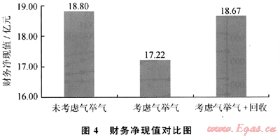 經(jīng)濟指標為財務內(nèi)部收益率,財務凈現(xiàn)值,靜態(tài)投資回收期,動態(tài)投資回收期,投資利潤率和投資利稅率[6]。根據(jù)經(jīng)濟指標得出:3種情況的財務內(nèi)部收益率均大于30%,大于石油財政基準收益率12%;若增添壓縮機,則投資成本能夠在1a內(nèi)收回;靜態(tài)和動態(tài)投資回收期均小于1a。如圖4,添加壓縮機回收低壓氣比目前壓縮機生產(chǎn)的財務凈現(xiàn)值能多獲得1.45億元。