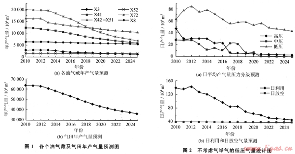 2) 不考慮氣舉氣時,目前的壓縮機能夠滿足氣田低壓氣回收的要求,2010~2025年可回收低壓氣為35.92×108m3;考慮氣舉氣時,需在2010~2016年增添壓縮機,若添置壓縮能力為20×104m3/d的壓縮機,則2011年、2012年和2014年需要2臺,其他時間只需1臺,預計可回收低壓氣47.26×108m3。