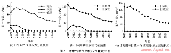 出于經(jīng)濟考慮,日產(chǎn)氣量低于1×104m3的低壓氣不考慮回收,如果統(tǒng)一添加壓縮能力為20×104m3/d的壓縮機,那么添置情況為2010年1臺,2011年和2012年2臺,2013年1臺,2014年2臺,2015年和2016年1臺。添加壓縮機之后,日利用和日放空氣量預測情況如圖3-c,預計到2025年累計可回收低壓氣為47.26×108m3,比放空方案多回收4.79×104m3。