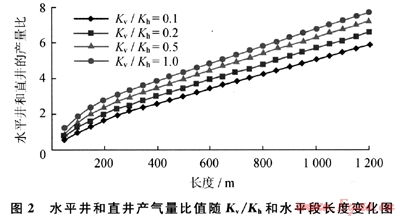 根據(jù)現(xiàn)代油藏工程計算,某凝析氣藏水平井和直井采氣量比值隨Kv/Kh值和水平段長度的變化而變化(圖2)。當Kv/Kh值為0.2、0.5和水平段長度為500m的條件下,水平井和直井產(chǎn)氣量比值分別為3.6和4.2。由此可見滲透率非均質(zhì)影響水平井的增產(chǎn)效果。