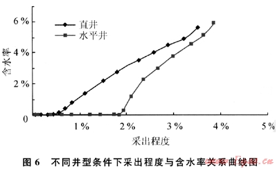 對于同一個邊底水油藏,采用不同的井型邊底水推進的速度是不一樣的。對于強底水情況,模擬了圓形地層中心1口直井或1口水平井的開采情況,其采出程度與含水率關系曲線見圖6。從圖中可以看出,水平井的無水開采期比直井的無水開采期長得多,水平井的采出程度也比直井高。因此同等情況下,水平井的開發(fā)效果要好于直井的開發(fā)效果。