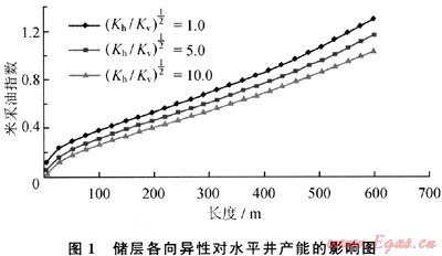通過對水平井擬三維產(chǎn)能方程進行離散得出了不同各向異性系數(shù)(水平滲透率與垂向滲透率比值的開方)下,水平井長度和米采油指數(shù)的關系。
