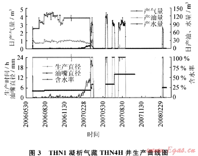 THN1凝析氣藏的生產(chǎn)動(dòng)態(tài)資料顯示,2007年7月開始排液采氣時(shí),排液井僅2口——THN2、THN4H井,且排液僅15d(7月12~27日)后即關(guān)井,至8月12日又才開井排液。排液井?dāng)?shù)少、排液時(shí)間短,在短時(shí)間內(nèi)不能完全阻止已推進(jìn)氣藏內(nèi)部的邊水繼續(xù)向前推進(jìn),導(dǎo)致內(nèi)部氣井,甚至一線井都不見效。