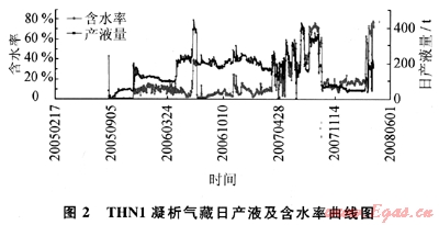 THN1凝析氣藏有邊水存在,由于氣藏開發(fā)初期生產(chǎn)壓差過大(部分氣井在2~10MPa),加之邊水較活躍,使得大部分井見水時(shí)間過早且產(chǎn)水量增加、含水率迅速上升,油氣產(chǎn)量大幅下降(圖1),氣藏的綜合含水率已達(dá)到79.68%(圖2),部分氣井已停噴。在2007~2008年后續(xù)開發(fā)過程中,采用了類似于油井的開發(fā)策略,對(duì)THN2、THN3、THN4、THN6、THN7、THN11井先后采用了電潛泵或管式泵機(jī)抽提液生產(chǎn),但從各井提液效果來看并不理想,機(jī)抽后氣井基本產(chǎn)水。