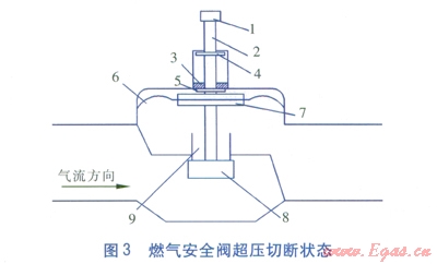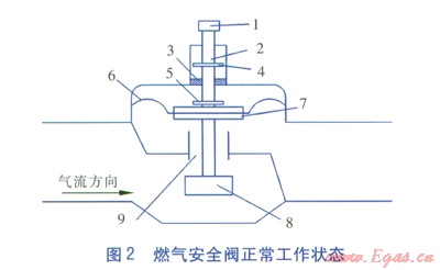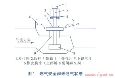 如圖l所示,此型號燃氣安全閥在未通氣狀態(tài)下,閥瓣在重力作用下下落,磁鐵3吸附上鎖氣片4,主閥瓣7關閉閥口9,燃氣安全閥處于切斷狀態(tài)。當燃氣安全閥通氣后,若不上提復位鈕進行手動復位,燃氣安全閥進睜壓力無法克服磁鐵3吸附上鎖氣片4的磁力作用,燃氣安全閥將一直處于如圖l所示的切斷狀態(tài)。