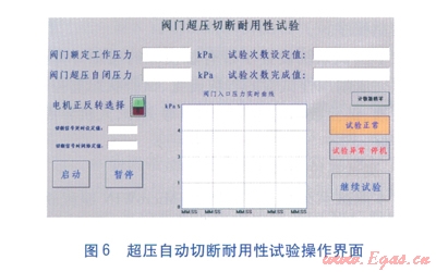 每一個耐用性試驗均存在其獨立的操作界面,并將全部界面顯示于一個綜合界面上,界面的切換采用彈出窗口的方式。燃氣安全閥的超壓自動切斷耐用性試驗的操作界面見圖6。