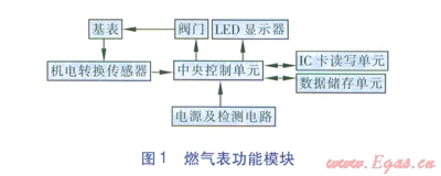 我公司研發(fā)的燃?xì)獗砉δ苣K組成見圖1。中央控制單元是該燃?xì)獗淼暮诵摹Mㄟ^Ic卡讀寫單元,使用異常流量參數(shù)IC設(shè)置卡或無線形式將燃?xì)猱惓A髁繀?shù)傳入燃?xì)獗淼闹醒肟刂茊卧ㄟ^中央控制單元保存到數(shù)據(jù)儲(chǔ)存單元中,作為異常流量的判斷依據(jù)。當(dāng)前的瞬時(shí)流量數(shù)據(jù)從基表通過機(jī)電轉(zhuǎn)換傳感器讀入到中央控制單元后,由中央控制單元計(jì)算出當(dāng)前表內(nèi)的瞬時(shí)流量值并與數(shù)據(jù)儲(chǔ)存單元中的異常流量參數(shù)范圍進(jìn)行比較。當(dāng)確認(rèn)流量異常時(shí),中央控制單元發(fā)出關(guān)閥操作信號(hào)給閥門,閥門關(guān)閉,同時(shí)向顯示器輸出異常流量信號(hào),顯示器顯示異常提示[1]。