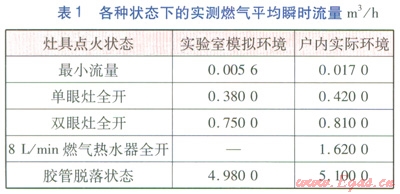 基表型號(hào)為Gl.6,氣源為天然氣,壓力為3000Pa,燃具在各種狀態(tài)下測(cè)定的瞬時(shí)流量經(jīng)整理后的平均值見表1。