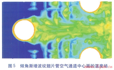 空氣進口速度為4m/s時,兩種波紋翅片管空氣通道中心面的溫度場分別見圖4、5。由圖4、5可知,兩種波紋翅片管的溫度分布都很紊亂且成狹長帶狀。在迎風側(cè),傾角漸增波紋翅片管空氣通道中心面空氣溫度上升得較快,且出口溫度高于均勻傾角波紋翅片管。這是由于傾角漸增波紋翅片結(jié)構(gòu)加強了氣流擾動,從而強化了換熱。兩種波紋翅片管的共同點是:在迎風側(cè),溫度場分布稠密,溫度上升較快,換熱較強烈;在背風側(cè),溫度場分布稀疏,溫度變化較小,換熱較平緩。
